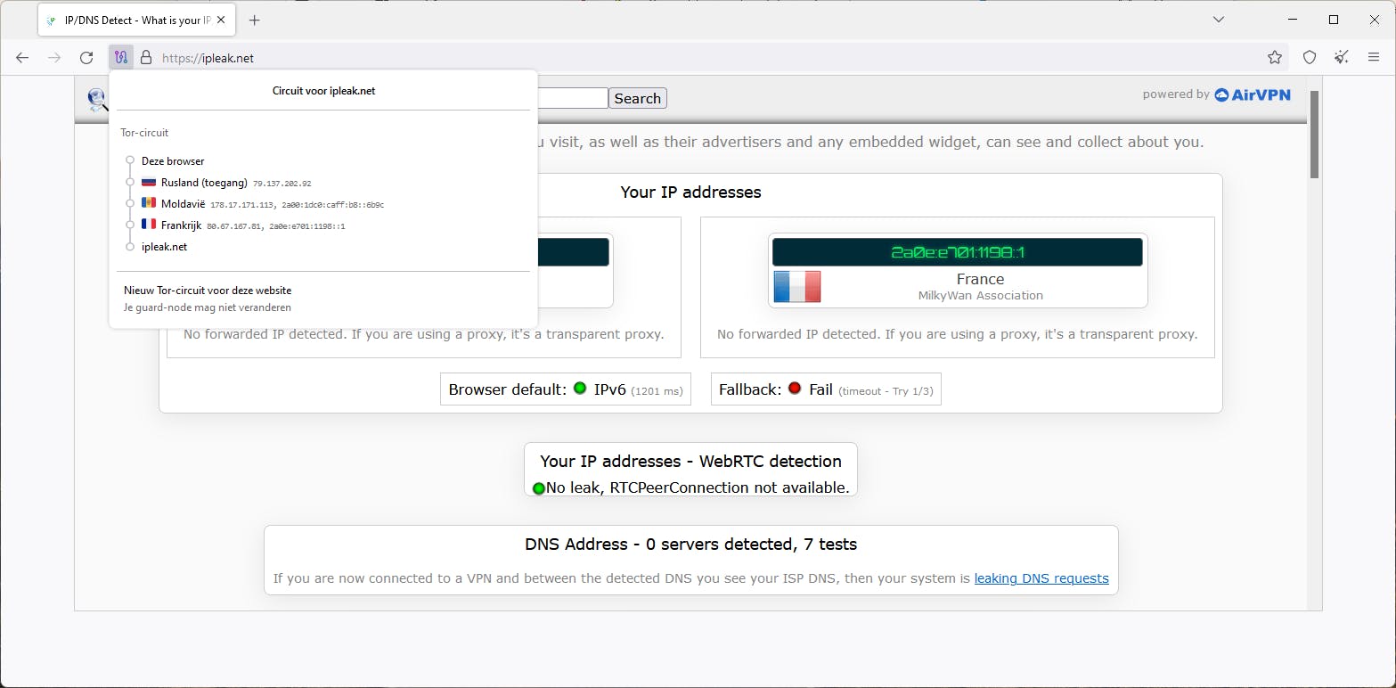 Je downloadt Tor Browser van www.torproject.org, beschikbaar voor Windows, macOS, Linux en Android. We nemen de Windows-versie als voorbeeld. Met enkele muisklikken installeer je de browser. Wanneer je voor de eerste keer opstart, druk je op de knop Verbinding, eventueel na het aanvinken van Altijd automatisch verbinding maken. Rechtsboven verschijnt kort de melding Verbonden. Test dit door bijvoorbeeld te surfen naar www.ipleak.net. Je ziet dan een ip-adres van je huidige exit node uit het Tor-netwerk, en dus niet die van je internetprovider. Via het knopje Tor-circuit, links van je adresbalk, zie je de ip-adressen en locaties van de andere twee nodes. Klik hier op Nieuw Tor-circuit voor deze website om de laatste twee nodes te wijzigen.