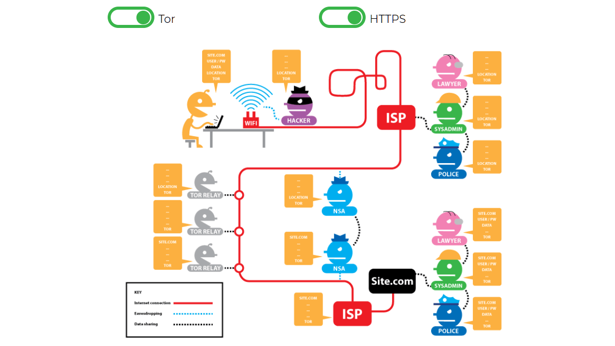 Beter kun je in de Tor Browser waar mogelijk uitsluitend websites via het https-protocol bezoeken. Dit zorgt voor een extra versleuteling. Je dwingt dit als volgt af: ga naar Instellingen / Privacy & Beveiliging, scrol naar Alleen-HTTPS-modus en kies Alleen-HTTPS-modus in alle vensters inschakelen. Onderstaande animatie geeft duidelijk aan welke data je met Tor al dan niet in combinatie met https verborgen houdt. Het is de moeite waard deze te bestuderen.