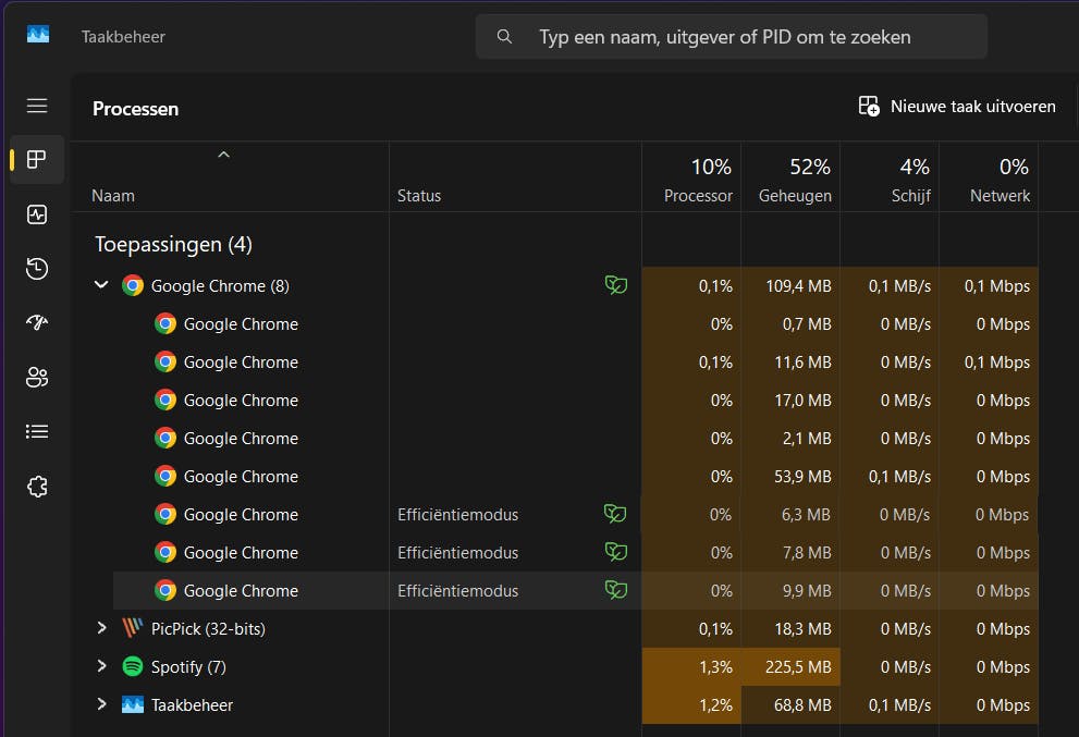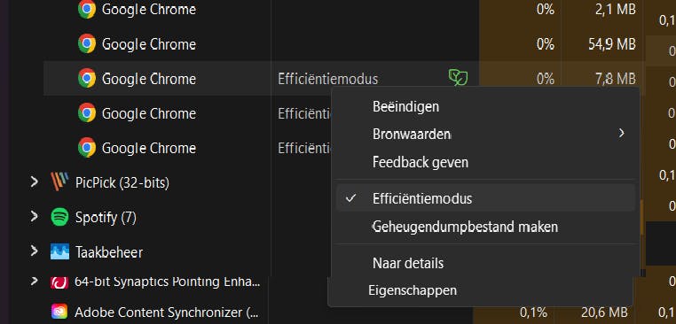 Het groene blaadje geeft aan dat bij deze processen de efficiëntiemodus actief is.