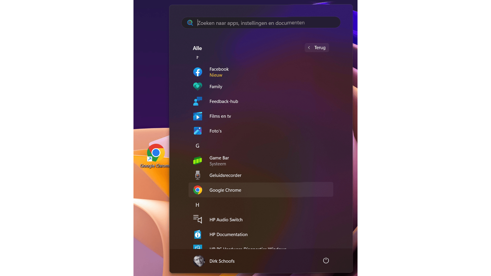 Begin met het plaatsen van een snelkoppeling voor Chrome op het bureaublad. Binnen Windows 11 verloopt dat anders dan in Windows 10. Klik op Start en selecteer rechtsboven de optie Alles. Hiermee verschijnt er een alfabetische lijst met alle apps. Zoek Google Chrome en sleep dit pictogram naar het bureaublad. Daar is de eerste snelkoppeling. Klik met rechts op deze snelkoppeling en kies Kopiëren. Daarna klik je op het bureaublad met rechts en je selecteert Plakken.