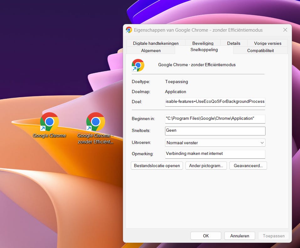 Deze aanpassing schakelt de efficiëntiemodus alleen uit als je Chrome start vanuit de bewerkte snelkoppeling.