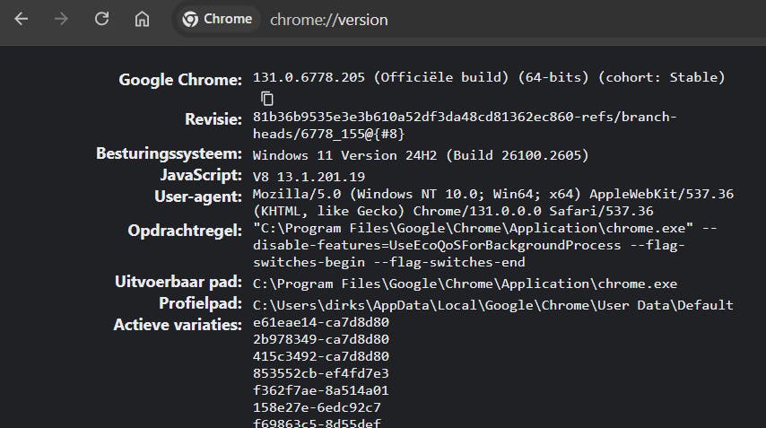 Om te controleren of de functie is uitgeschakeld open je de snelkoppeling zonder efficiëntiemodus. Typ in het adresvak chrome://version en druk op Enter. Hierdoor zullen de details van Chrome op je pc in beeld komen. En daar zul je de opdrachtparameters lezen die je zojuist hebt toegevoegd. Als je Chrome opent vanaf de eerste snelkoppeling (met efficiëntiemodus) en je typt chrome://version, dan zul je deze parameters niet terugvinden. Ook wanneer je het oorspronkelijke Chrome-uitvoerbare bestand start vanuit de map C:\Program Files\Google\Chrome\Application zul je ontdekken dat de efficiëntiemodus nog steeds aan staat.