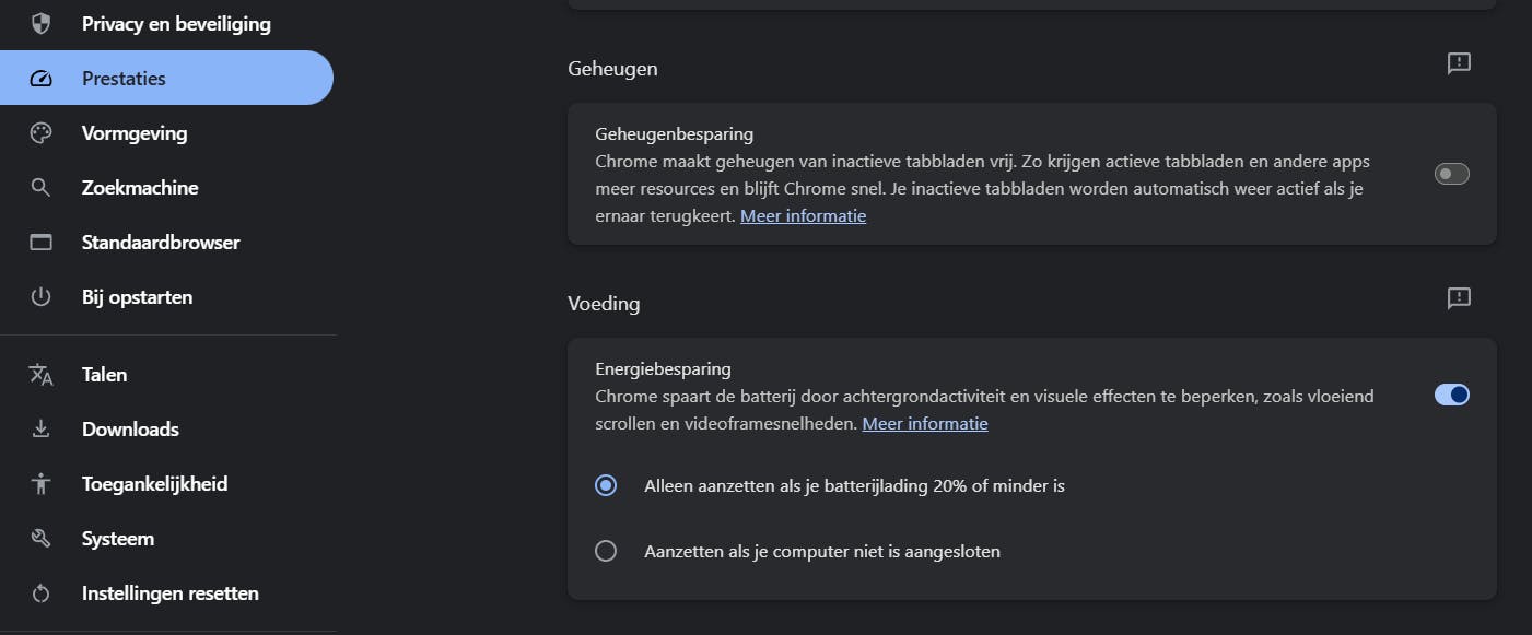 Behalve de efficiëntiemodus gebruikt Chrome ook functies voor geheugen- en energiebesparing. Beide verminderen het stroomverbruik van de browser door bepaalde functies en mogelijkheden te beperken, maar ze kunnen ook de browserprestaties vertragen. Om ze uit te schakelen, tik je op de drie puntjes in de rechterbovenhoek en ga je via Instellingen naar Prestaties. Je kunt ook in het adresvak chrome://settings/performance typen en dan op Enter drukken. Hiermee kom je op het tabblad Prestaties. In dit tabblad kun je de schuifjes bij Geheugen / Geheugenbesparing en Voeding / Energiebesparing uitschakelen.