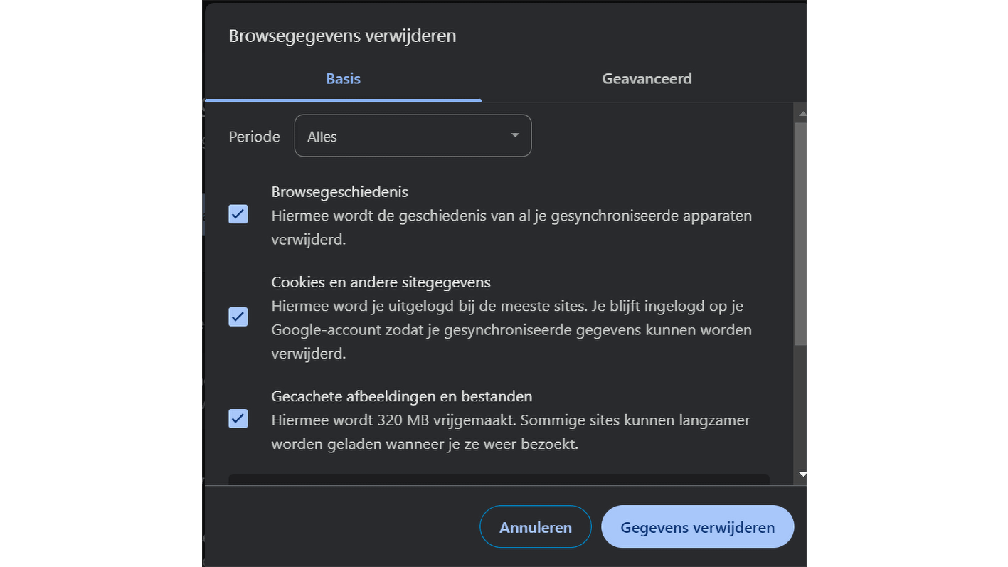 Wanneer je de Chrome-browser lang gebruikt, verzamel je heel wat gegevens in de browsercache en ook veel cookies, wat de browser kan vertragen. Je kunt dit probleem oplossen door de browsegegevens te wissen. Klik op de drie puntjes in de rechterbovenhoek van de browser. Selecteer Browsegegevens wissen. Vervolgens selecteer je de vakjes Cache en Cookies en je klikt op Gegevens wissen. Als dat is gebeurd, start je Chrome opnieuw op en kijk je of het programma nog steeds traag is.