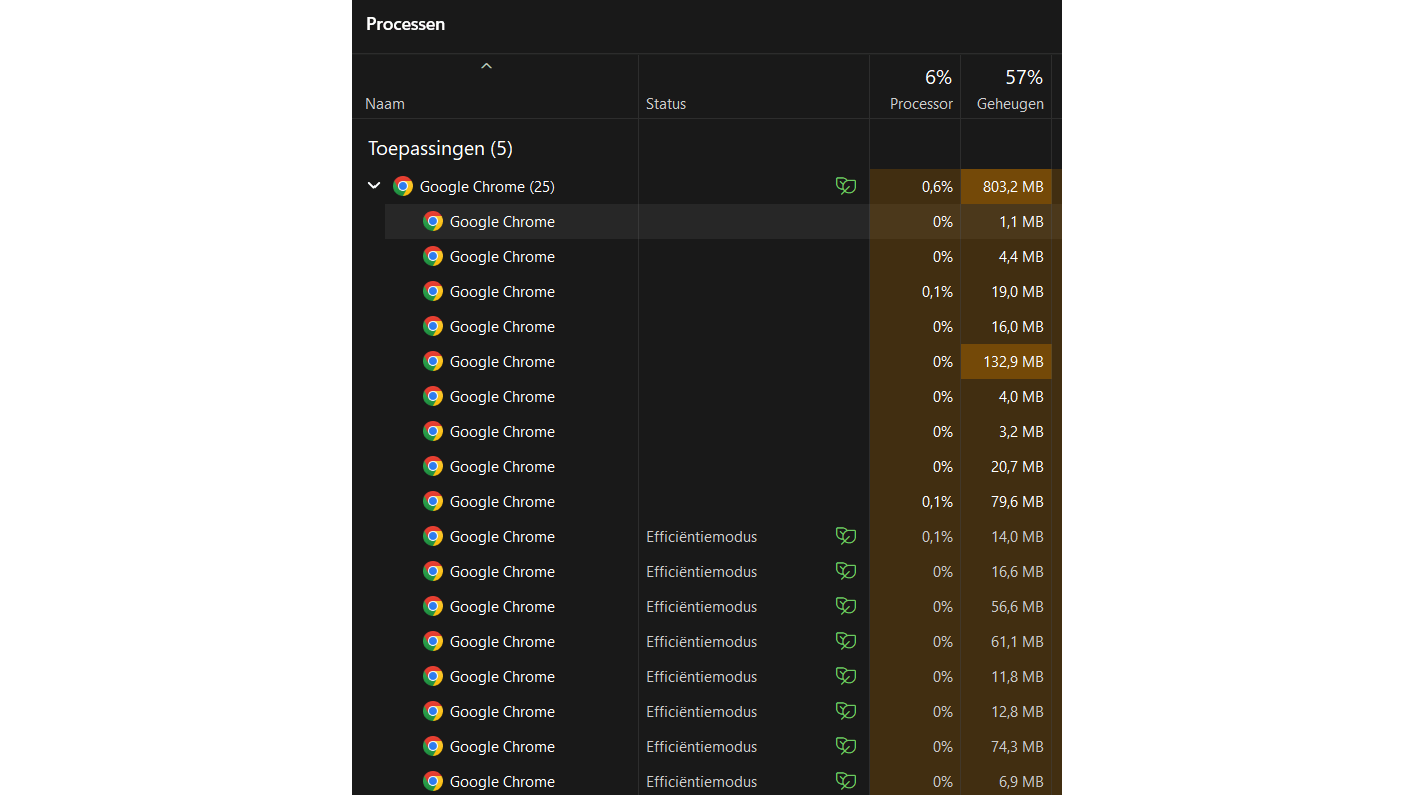 In de app die opent, zoek je nu het proces Google Chrome. Klik op het pijltje ernaast om deze groep uit te vouwen. In de kolom Status staat Efficiëntiemodus naast alle processen waarvoor deze functie is ingeschakeld. Wanneer je dit label aantreft, weet je dat deze modus over het algemeen actief is voor Google Chrome. De efficiëntiemodus is ook herkenbaar aan een pictogram van een groen blaadje.