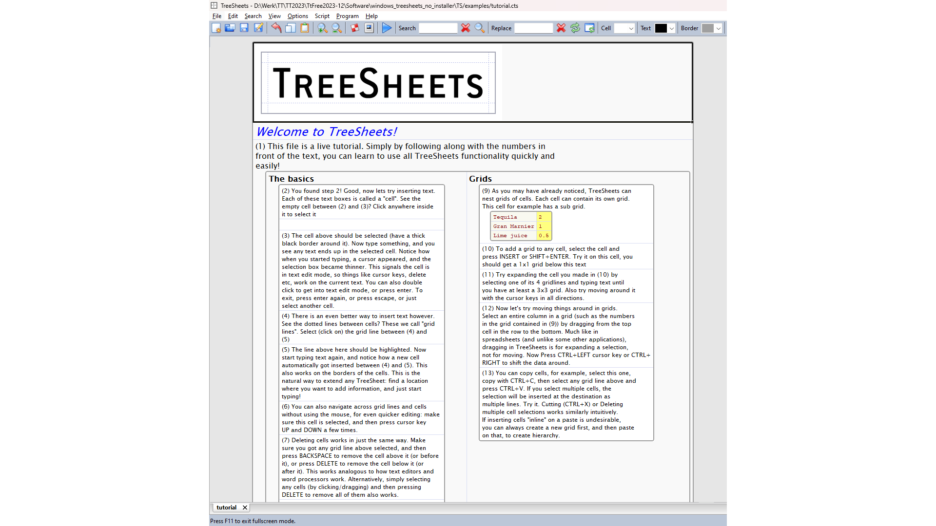 TreeSheets werkt met tabbladen en als je kiest voor File / New (of Ctrl+N), dan zal de Engelstalige mini-tutorial (want dat is het bestand dat automatisch wordt geopend) gewoon open blijven op zijn eigen tabblad.