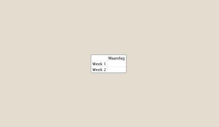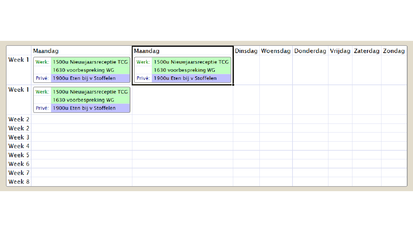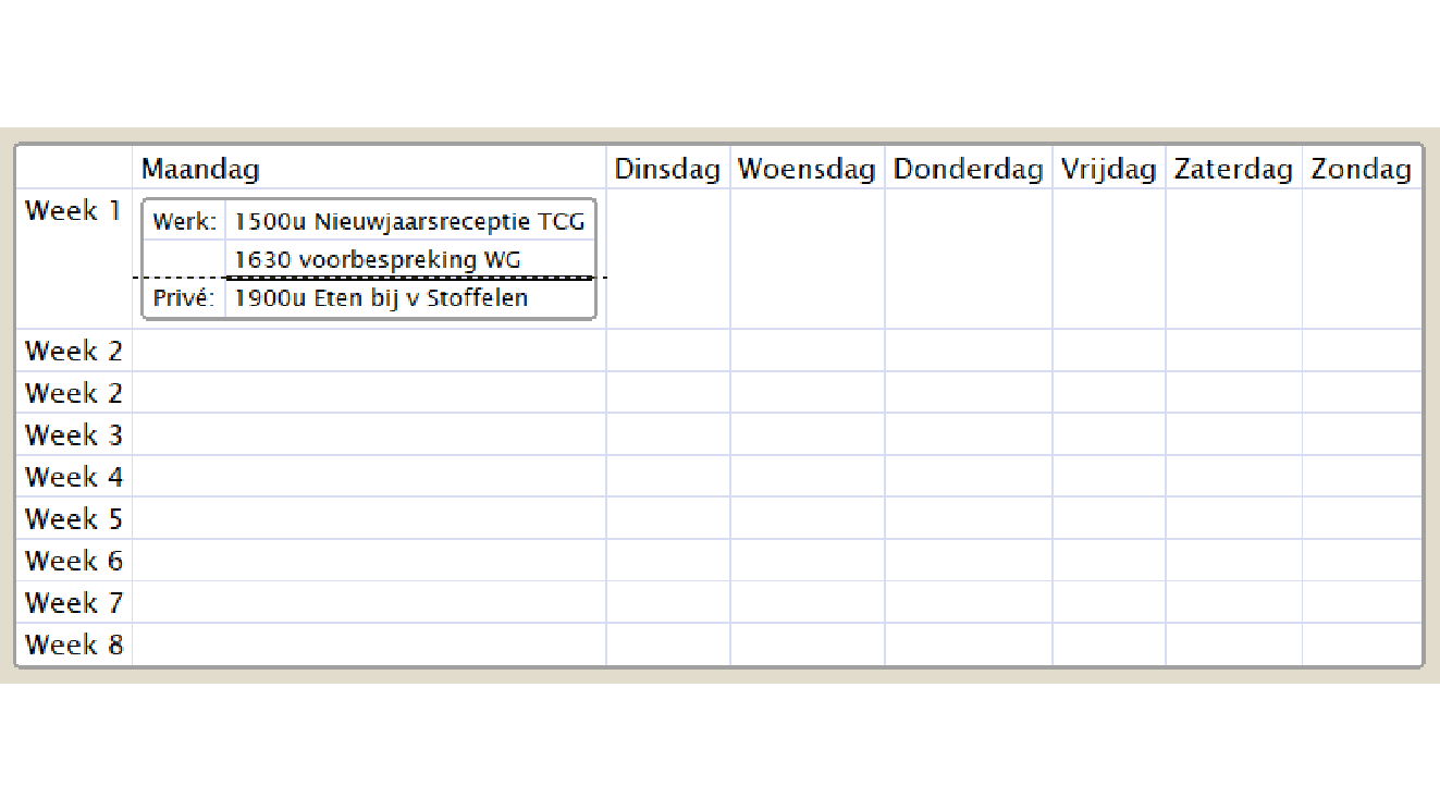 Het zal je inmiddels duidelijk zijn dat we een weekkalender aan het opzetten zijn en dat we die met de kennis die we nu hebben, eenvoudig kunnen voltooien. Het resultaat lijkt ogenschijnlijk op een spreadsheet of tabel in een tekstverwerker. TreeSheets kent echter een foefje waar andere programma’s meer moeite mee hebben of helemaal niet kunnen: cellen in cellen.