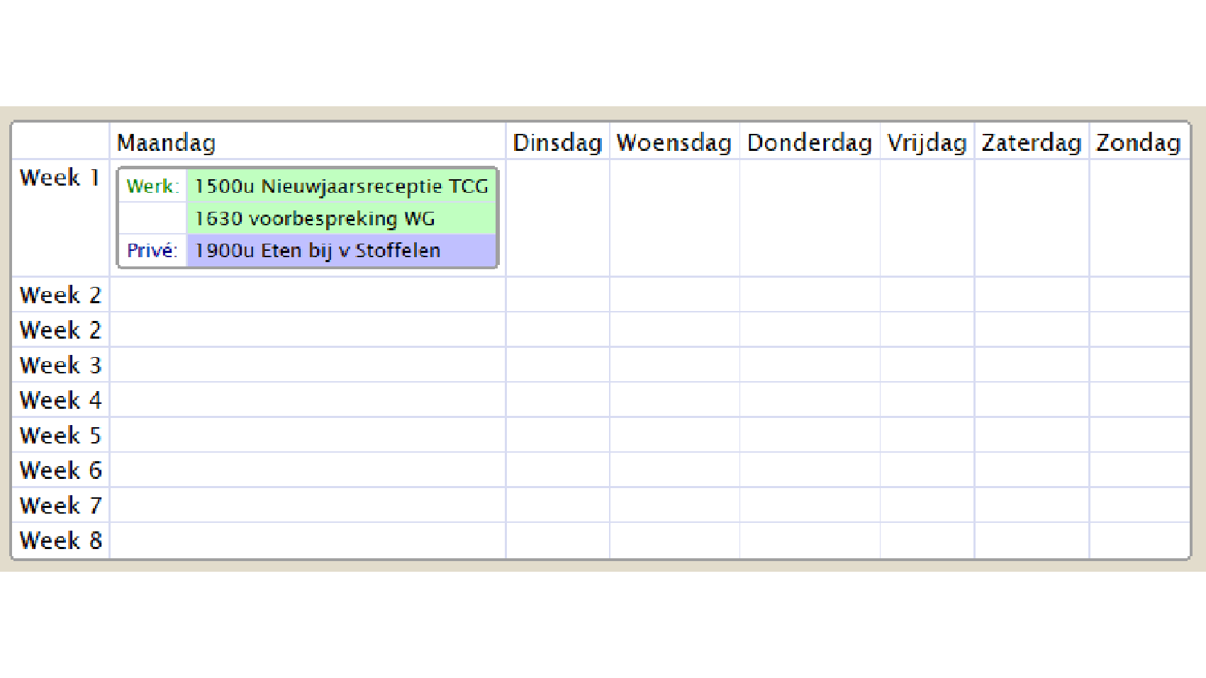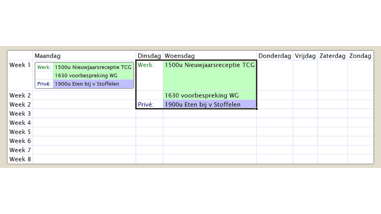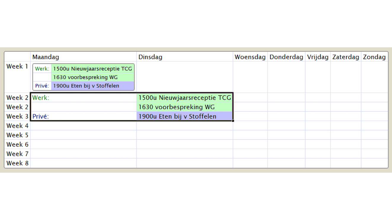 Selecteer de eerste lege cel achter Week 1 en druk op Shift+Enter. Er is nu een nieuwe cel in deze cel gevormd. Typ daarin Werk:. Druk tweemaal op Enter om daaronder een nieuwe cel te maken en typ daarin Privé:. Je kunt hierna op de inmiddels bekende manier achter deze cellen eenvoudig nieuwe toevoegen waarin je afspraken noteert.
