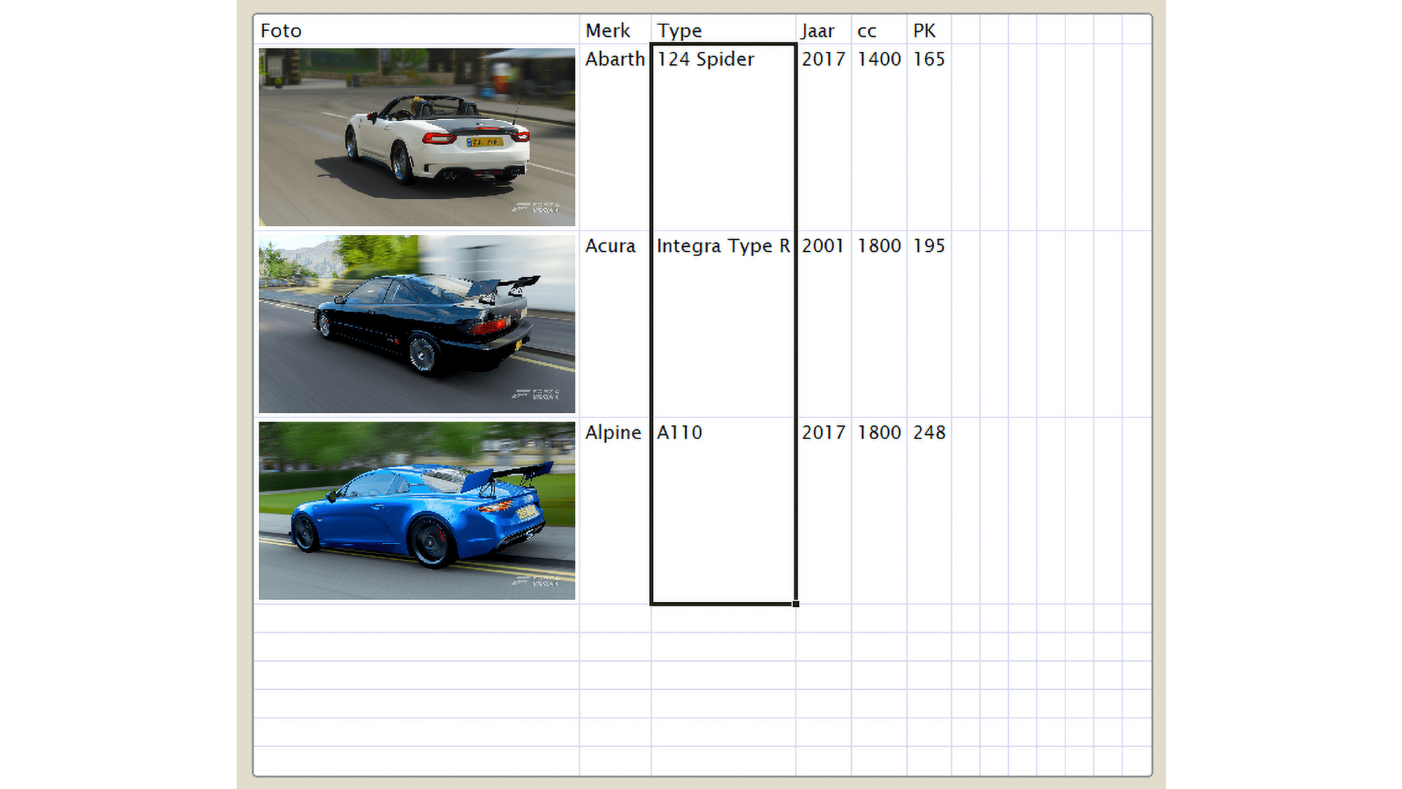 Je begint met een nieuw werkblad en aanvaardt de standaardgrootte van 10. De cellen op de bovenste regel geef je namen, bijvoorbeeld Foto, Merk, Type, Jaar enzovoort.