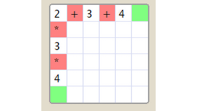 Maak een nieuw document met grootte 6 en vullen dat in zoals op de afbeelding hieronder. De bewerkingen + en * staan op een witte achtergrond wanneer je ze invoert, wat betekent dat het om gegevens gaat. Via het menu Program / Mark As / Operation kun je aangeven dat de cel als bewerking moet worden geïnterpreteerd. De lege cellen aan het eind van de eerste regel en onderaan de eerste kolom maak je groen via Program / Mark As / Horizontal View en Vertical View. Klik je nu op de afspeelknop (Run), dan verschijnen in de groene cellen de antwoorden.