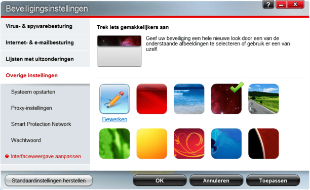 Verwacht dus geen rare onnodige functies, maar gewoon beveiliging tegen malware, scareware, onveilige websites etc. Door de instellingen van het programma bent u dus snel heen gebladerd. Drie punten vallen hierbij echter op: het is bij het wijzigen van opstartinstellingen nodig om de herstarten, beperkt de functie om schadelijke browserscripts te herkennen zich tot Internet Explorer en Firefox en is de mogelijkheid om de interface een persoonlijk tintje mee te geven een bijzondere, doch vreemde eend in de bijt.