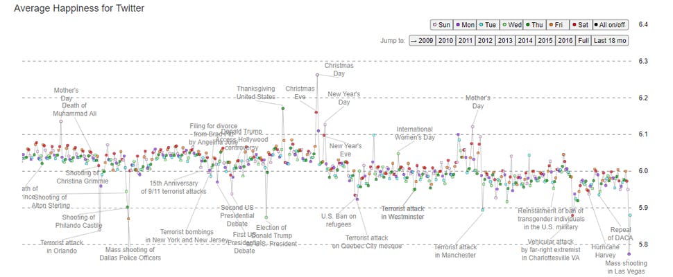 Nog niet eerder vielen er zoveel doden en gewonden bij een schietincident in de Verenigde Staten, en Twitter-gebruikers waren gezamenlijk nog niet eerder zo verdrietig. Andere dagen van massale Twitter-rouw waren er ten tijde van de schietpartij in Orlando (5,84), en ook treurden velen op de dag dat Donald Trump werd verkozen tot de nieuwe president van de VS (5,87).