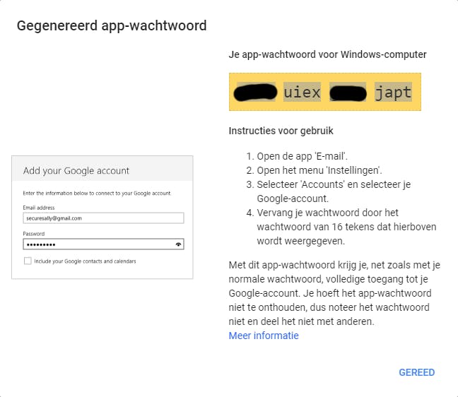 Meld je met je eerste G-mailaccount aan op https://myaccount.google.com en open het tabblad Beveiliging. Klik in het rechterpaneel, bij de sectie Inloggen bij Google op App-wachtwoorden. Vul je wachtwoord in en druk op Volgende. Vul de ontvangen code in - laat eventueel het vinkje staan bij Niet meer vragen op deze computer - en druk nogmaals op Volgende. Selecteer in het volgende venster de app (bijvoorbeeld ‘E-mail’) en het apparaat (bijvoorbeeld ‘Windows-pc’) waarvoor je het app-wachtwoord wilt genereren. Zodra je op de knop Genereren drukt, duikt een code van zestien letters op die je meteen noteert. Meer informatie over inloggen met app-wachtwoorden vind je via de link.