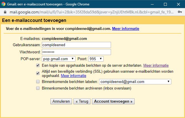 Laat veiligheidshalve het vinkje staan bij Altijd een beveiligde verbinding (SSL) gebruiken wanneer e-mailberichten worden opgehaald (afbeelding 5). Eventueel plaats je een vinkje bij de optie Binnenkomende berichten labelen en/of Binnenkomende berichten archiveren (inbox overslaan). Bevestig met Account toevoegen.
