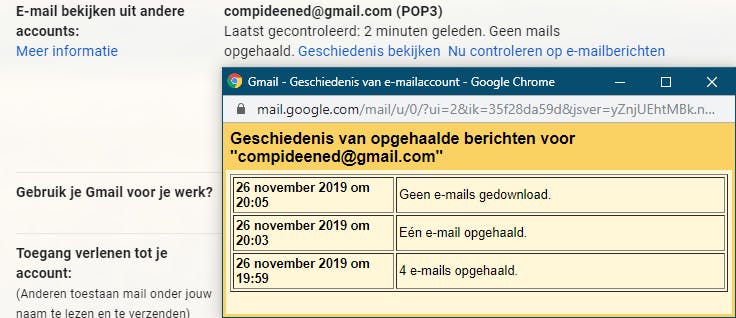 Als alles goed is zal alle mail uit je eerste account nu op regelmatige tijdstippen worden opgehaald in je tweede account. Wanneer dat precies is gebeurd en hoeveel berichten er tijdens de laatste ronde werden opgehaald verneem je via Instellingen, op het tabblad Accounts en import, bij E-mail bekijken uit andere accounts. Hier tref je trouwens ook de links Geschiedenis bekijken en Nu controleren op e-mailberichten aan. Deze laatste optie is handig als je niet langer wilt wachten en je onmiddellijk op potentiële mails wilt laten checken.