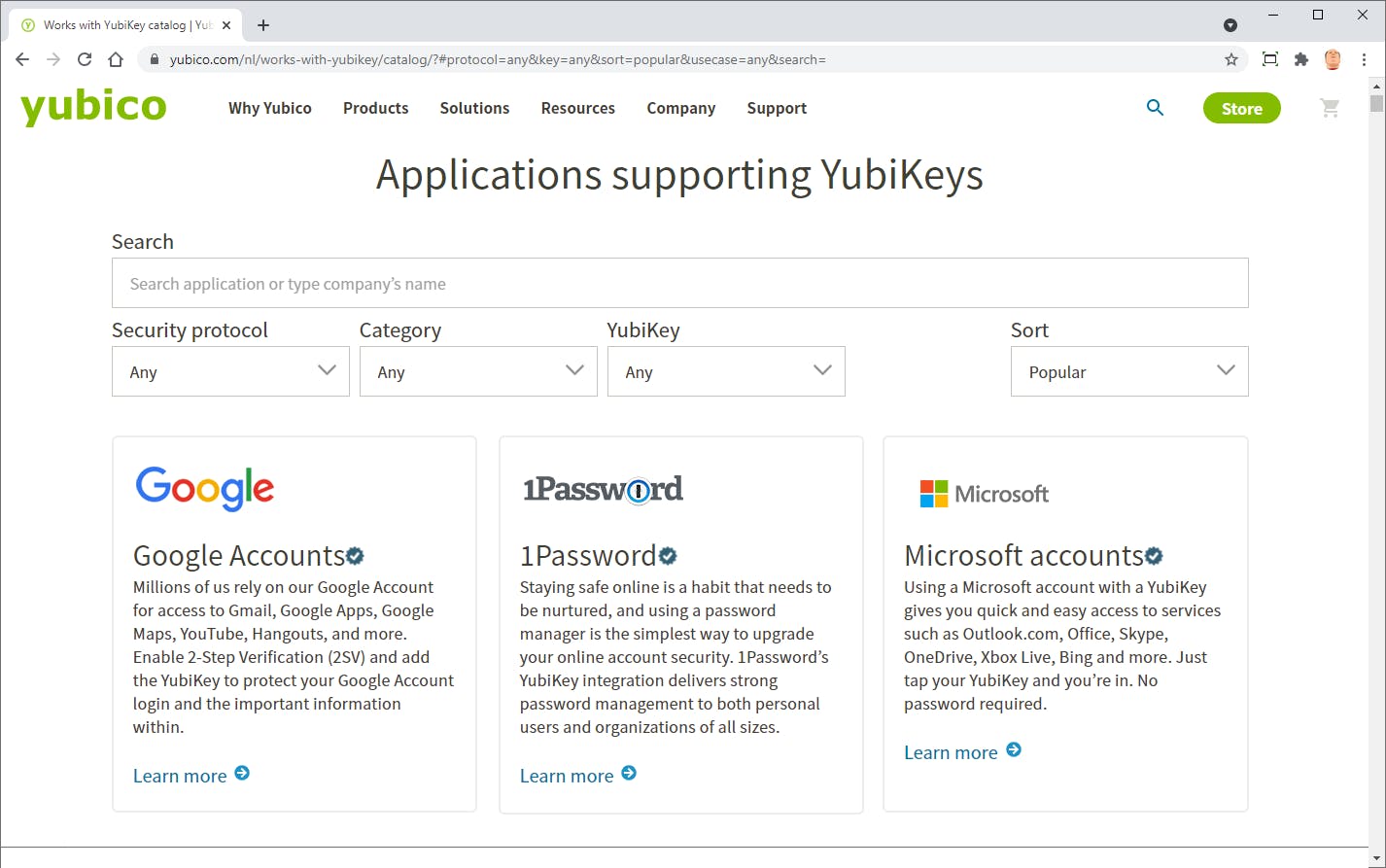 Een goed overzicht van sites en de ondersteunde vorm van MFA/2FA is te vinden op www.2fa.directory en specifiek voor Yubikeys op www.tiny.cc/yubikey. Bij elke site die genoemd wordt, vind je een verwijzing naar de uitleg over het koppelen van de Yubikey.