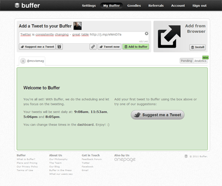 Zodra uw account is gekoppeld, kunt u berichten toevoegen via de site. Het idee is dat u voortaan Buffer gebruikt om berichten te tweeten, en mocht u het niet zien zitten om telkens op de site in te loggen, dan kunt u ook een Buffer-werkbalk installeren in uw browser. Standaard bepaalt Buffer vier tijden waarop uw berichten zullen worden getweet. Tijdens het tweeten kunt u aangeven of u direct wilt tweeten of een bericht toe te voegen aan de buffer. Ook aardig is de knop Suggest me a Tweet, waarmee u een leuk citaat kunt genereren.