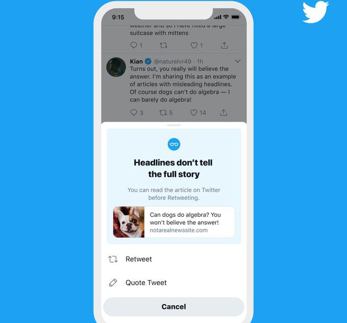 Achter de schermen merkt Twitter het namelijk op zodra je een artikel 'retweet' zonder dat je de link naar de onderliggende website hebt geopend. Er komt dan een melding met de boodschap 'koppen vertellen niet het hele verhaal' in beeld. Het sociale medium wil zijn gebruikers zo stimuleren om eerst wat dieper te graven, voor ze de tweet in kwestie verder verspreiden.