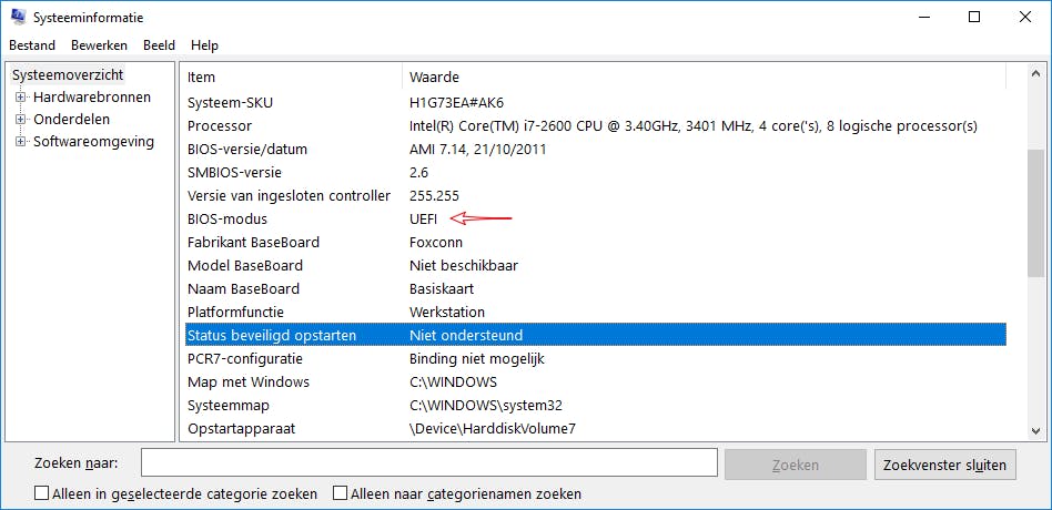 In dit laatste geval biedt je systeem dus geen ondersteuning aan voor secure boot. Of je hebt Windows geïnstalleerd in de oudere bios-modus; bij Bios Modus staat dan de optie Verouderd, in plaats van UEFI.