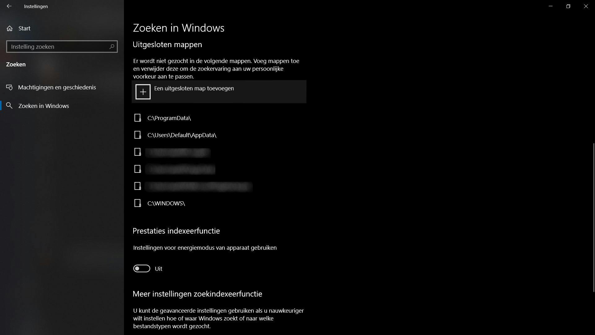 Dan hebben we tot slot nog twee andere opties op deze pagina: Prestaties indexeerfunctie en Meer instellingen zoekindexeerfunctie. Wanneer je wil dat de uitgebreide zoekmachine de energie-instellingen van je laptop respecteert, dan schuif je hier het vinkje van links naar rechts (en dus van Uit naar Aan). Met de tweede optie heb je nog meer invloed op de manier waarop Windows 10 je computer doorzoekt. Wanneer je op Geavanceerde instellingen zoekindexeerfunctie klikt (de blauwe tekst) dan kun je allerlei locaties selecteren waarvan je wil dat Windows ze meeneemt.