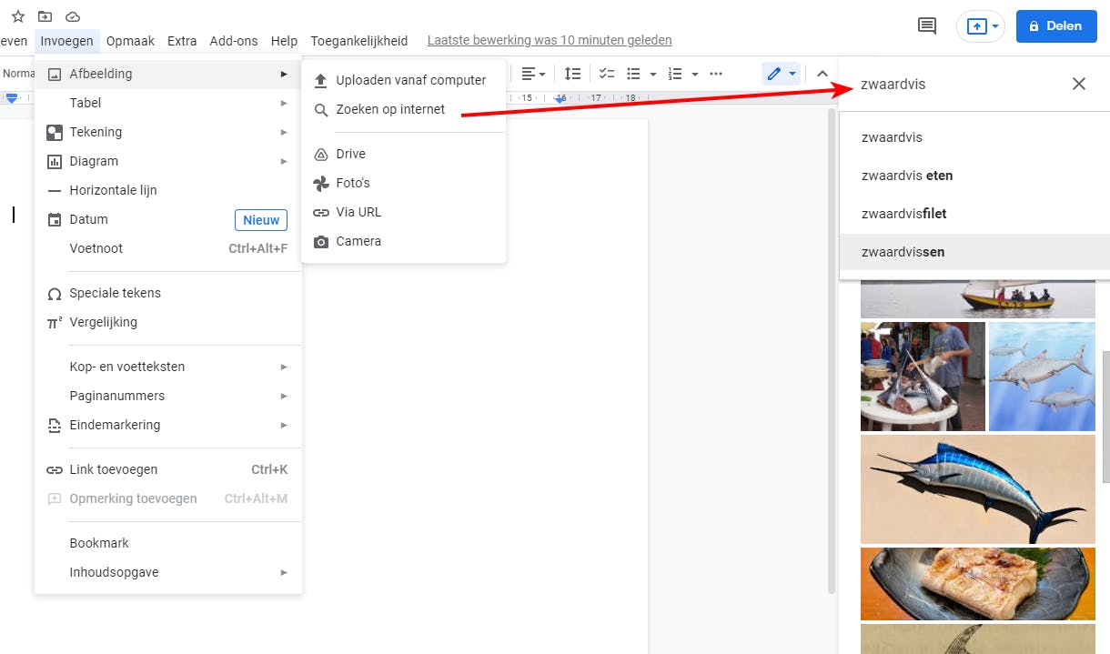 Om een afbeelding toe te voegen in het onlinedocument gebruik je het menu Invoegen. Vanaf daar kun je een afbeelding selecteren uit Google Foto’s, uit een map op de harde schijf of je kunt vanuit de ingebouwde zoekmachine het internetaanbod raadplegen. Wij kiezen in dit voorbeeld voor de laatste mogelijkheid. Daarmee verschijnt er een balk aan de rechterkant waar je bovenaan zoekwoorden typt. Dubbelklik op de afbeelding die je in het document wilt plaatsen. Vaak is zo’n afbeelding veel te groot. Door op het plaatje te klikken, verschijnen er handvaten waarmee je de afbeelding kunt verkleinen. Daarna geef je in de werkbalk aan hoe je afbeelding wilt uitlijnen: links, centraal of rechts.