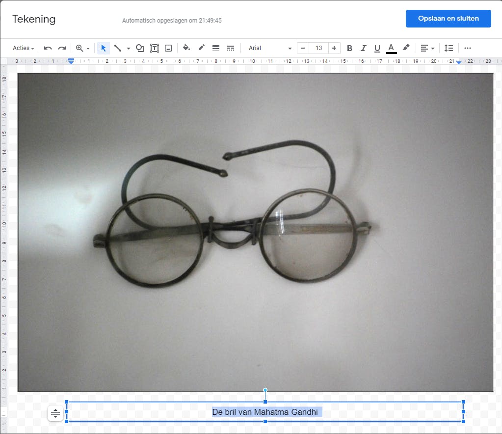 Als je tevreden bent, klik je op de blauwe knop Opslaan en sluiten. Hierdoor behandelt Google Docs de afbeelding en het bijschrift voortaan als één element. Wil je achteraf toch nog iets in het bijschrift wijzigen, dan klik je op de afbeelding en vervolgens kun je onder het plaatje de knop Bewerken gebruiken. Hierdoor kom je terug in de tekenmodule waar je de tekst kunt wijzigen.