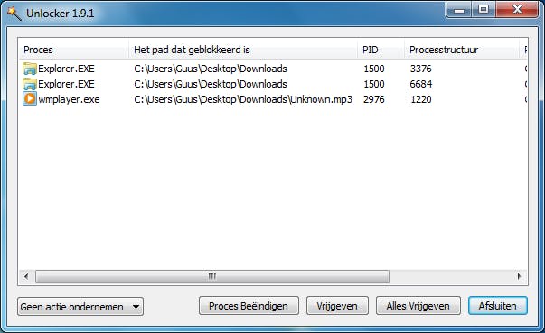 Unlocker is het bekendste programma op dit gebied. De werking is eenvoudig: u klikt met uw rechtermuisknop op het onwillige item en kiest in het contextmenu de optie Unlocker. Er verschijnt een venster dat alle geblokkeerde processen toont. Door op de knop Vrijgeven of Alles Vrijgeven te klikken, wordt de blokkade opgeheven, waarna u het item kunt verwijderen. Unlocker kan zowel met mappen als bestanden overweg.