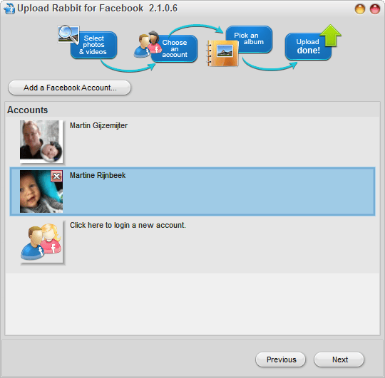 De mogelijkheid om in te loggen met verschillende accounts is de troef van deze tool. Helaas valt het wat tegen. U kunt niet naar twee verschillende accounts tegelijk uploaden, daarvoor moet u alle handelingen twee keer doorlopen. Het uploaden zelf is wel heel handig, u kiest een album (of maakt er een), klikt op Next en het uploaden kan beginnen.