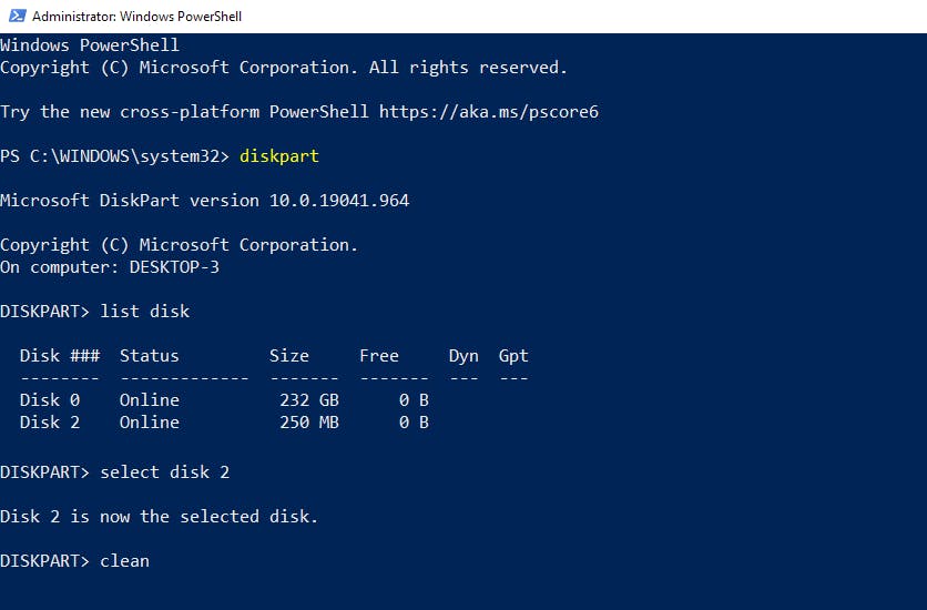 Windows heeft een ingebouwde functie om alles van de usb-stick te wissen, waarna je hem opnieuw kunt formatteren. Typ in het zoekvak PowerShell en voer deze tool uit als administrator. Typ Diskpart, dat is het hulpprogramma voor schijfpartitionering van Microsoft. Na iedere opdracht druk je op Enter. Vervolgens typ je naast Diskpart de woorden list disk. Nu verschijnt er een lijst van alle schijven die op de computer zijn aangesloten. Aan de hand van de grootte herken je de usb-drive. Vervolgens typ je select disk #. In plaats van # typ je het nummer van de usb-drive. Zorg dat je zeker niet het nummer van de harde schijf typt! Vervolgens typ je de opdracht clean. Hierdoor wordt de inhoud van usb-drive volledig schoongemaakt. Typ exit om het PowerShell-venster te verlaten.