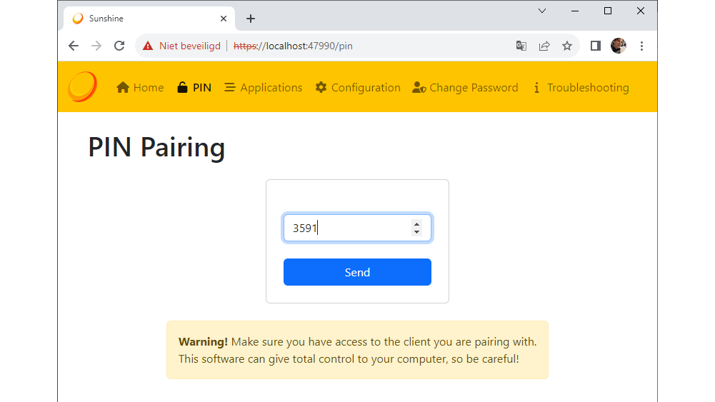 Sunshine wordt geconfigureerd via een webinterface die bereikbaar is via https://localhost:47990. Je kunt de interface van Sunshine eenvoudiger openen met de snelkoppeling in het startmenu, die opent de juiste pagina in de browser. Wanneer je ervoor hebt gekozen om Sunshine niet automatisch te starten, moet je die snelkoppeling sowieso gebruiken. Je browser geeft een waarschuwing omdat Moonlight een zelfondertekend certificaat gebruikt, dat kun je negeren.