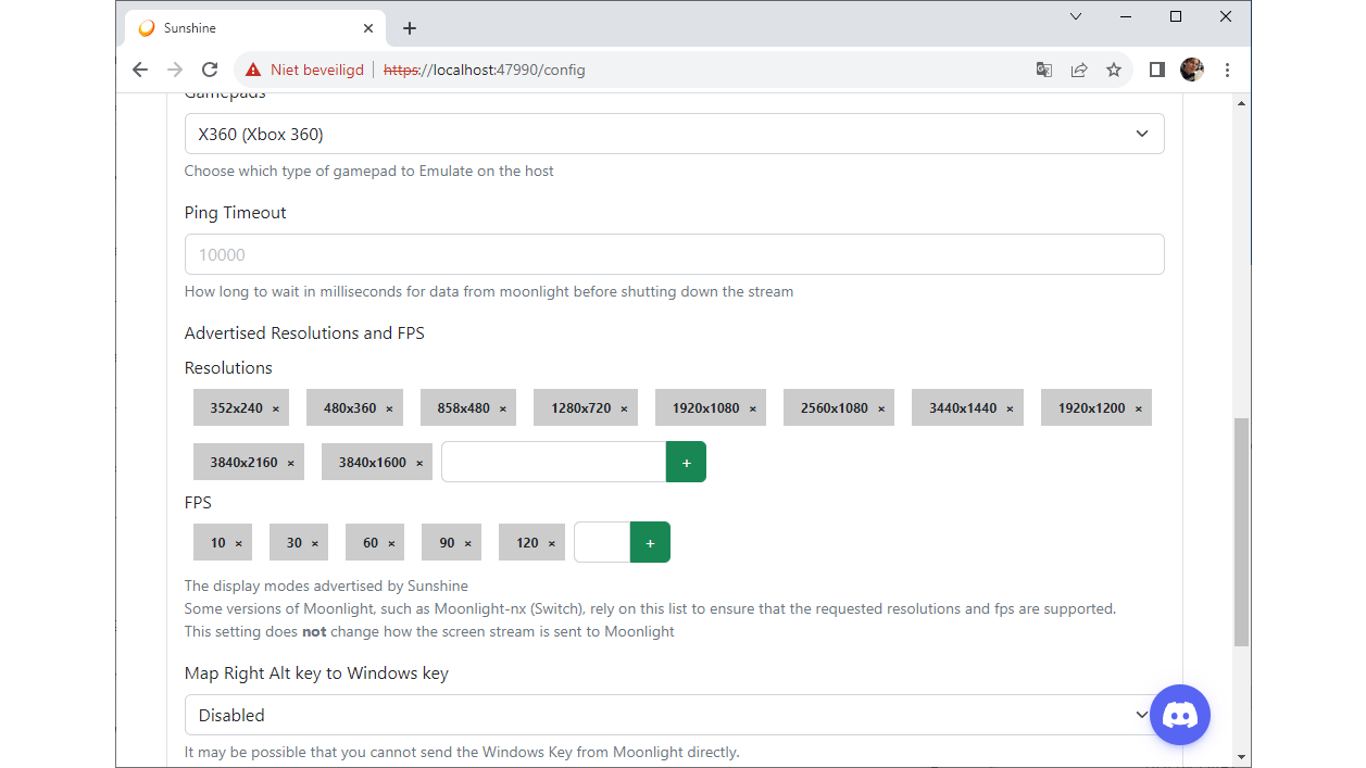 Uiteindelijk wordt de stream opgezet door de client en in de standardconfiguratie kan een client vrijwel alle mogelijke combinaties opvragen. Je vindt de toegestane eigenschappen in Sunshine via Configuration / General. Als je naar beneden scrolt, zie je daar toegestane resoluties en fps-waarden. Wat betreft videocodering gebruik je H.264 of HVEC (x265).