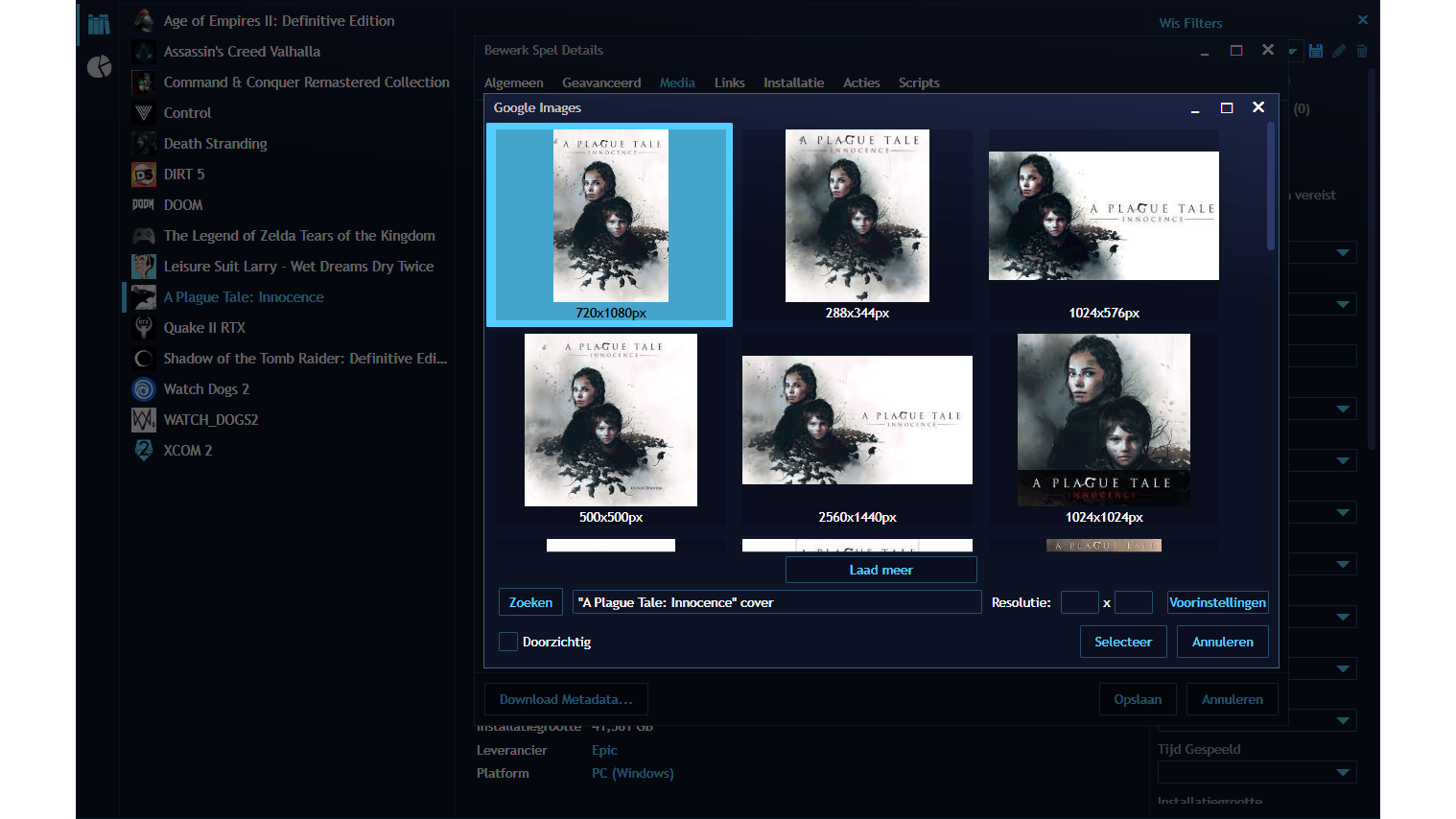 Heeft een spel geen metadata, zoals afbeeldingen? Start Playnite via de normale snelkoppeling in de desktopmodus en klik met rechts op de naam van het spel en kies Bewerk. Klik vervolgens op de knop Download metadata en kies IGDB. Soms werkt dit niet. Je kunt dan een afbeelding toevoegen door in de bovenste balk te kiezen voor Media en dan bij zowel Cover Afbeelding als Achtergrond Afbeelding op het pictogram van een wereldbolletje te klikken. Je kunt nu een keuze maken uit de voorgestelde afbeeldingen die gevonden zijn op Google.