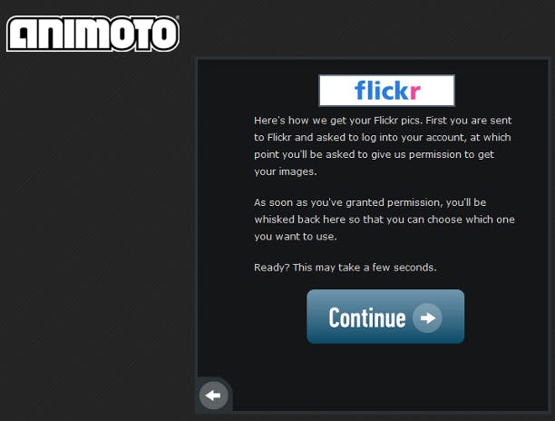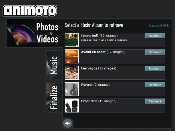 Wilt u bijvoorbeeld foto's gebruiken die u op Flickr hebt geplaatst, dan stuurt Animoto u tijdelijk door naar de website van Flickr, zodat u zich daar kunt aanmelden. Animoto krijgt zodoende nooit de beschikking over uw aanmeldgegevens. Vervolgens vraagt Flickr of u ermee instemt dat Animoto uw foto's ophaalt. Het gaat alleen om het opvragen van foto's. Animoto kan dus niets aanpassen en ook geen berichten uit uw naam versturen. Het scheelt als u uw foto's in albums, de zogeheten sets, hebt ingedeeld. In dat geval kunt u kiezen welke verzameling Animoto moet ophalen. Staan al uw foto's ongesorteerd bij elkaar, dan worden ze allemaal binnengehaald. In Animoto is later nog wel aan te geven welke beelden u wel en niet wilt gebruiken.