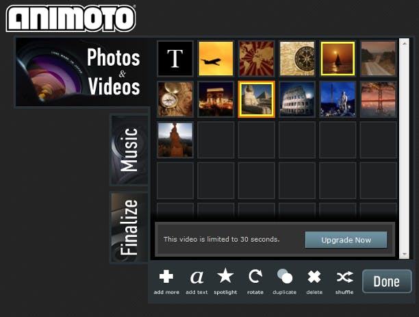 Zodra u het beeldmateriaal geselecteerd hebt, ziet u een matrix met miniaturen. Op dit scherm kan de selectie nog verder worden uitgebreid via add more, zodat u beeldmateriaal uit meerdere bronnen kunt gebruiken. Foto's weghalen uit de selectie kan ook, net als foto's roteren, de volgorde aanpassen en eventueel ergens een tekstdia toevoegen. Bij foto's die u extra in het zonnetje wilt zetten klikt u op spotlight, dat wordt met een sterpictogram weergegeven. Zo'n foto wordt dan wat langer 'in de schijnwerpers gezet' dan de overige beelden, zodat het meer aandacht krijgt. Alles naar wens aangepast? Klik dan op Done.