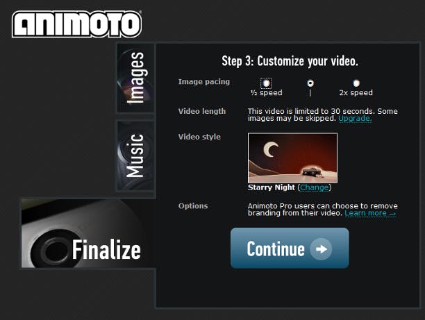 Wanneer u tevreden bent met uw fotoselectie, kunt u een leuk muziekje uitkiezen. Omdat u eerder al een thema hebt gekozen, kan het zijn dat er al meteen een voostel wordt gedaan voor een muziekstuk dat daar prima bij past. Dan is klikken op Continue voldoende om hiermee verder te gaan. Wilt u toch liever andere muziek hebben, dan kan dit met een klik op de link change your soundtrack. Als er geen muziek bij het thema zit, kunt u uw eigen muziek (mp3) uploaden of iets uitkiezen uit de collectie van Animoto.