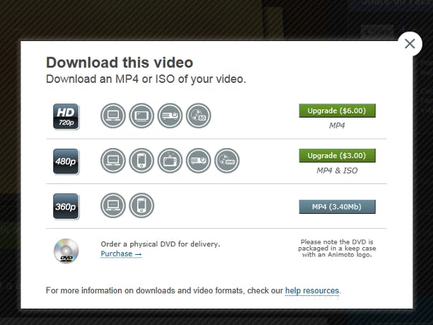 Wilt u de film opslaan op uw computer? Ook dat kan. Klik hiervoor onder de film op de knop Download. De versie met een standaard kwaliteit (van 240p of 360p) is volledig gratis. Hebt u er drie dollar voor over, dan krijgt u een versie in hogere kwaliteit (480p) die ook op grotere (televisie)schermen goed is te bekijken, inclusief een iso-bestand dat u zelf op een dvd kunt branden. Dit bijbetalen wordt een upgrade genoemd en kan zonder dat u een betaald abonnement hebt afgesloten, dus gewoon met de gratis lite-editie. Betaalt u echter regelmatig voor een losse film, dan is een (maand)abonnement al snel voordeliger. Bij sommige videostijlen is voor zes dollar ook nog een versie in HD (720p) beschikbaar. Tot slot kunt u een kant-en-klare dvd aanschaffen voor ongeveer 22 dollar (16 euro).