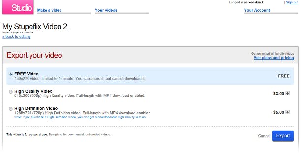 Rechts bovenin, onder de knoppen voor het toevoegen van beeld en muziek, bevindt zich een pictogram van een tandwieltje. U geeft er de filmnaam op en kunt het afspeeltempo instellen. Om tussendoor het resultaat te bekijken, klikt u links bovenin op Quick Preview, zodat u ziet of u met uw film op de goede weg bent. Klaar? Dan laat u met een klik op Export de film genereren. Eerst krijgt u nog de gelegenheid om een abonnement af te nemen, maar klik onder de kadertjes gerust op No thanks - I just want to export this video om meteen verder te gaan. In het vervolgscherm is een film met een resolutie van 270p volledig gratis. Bent u bereid te betalen, dan krijgt u voor drie dollar een film met 360p en voor vijf dollar een film in HD (720p). Die films mag u dan ook downloaden. Betalen kan met PayPal.