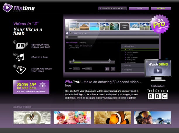 Bij Flixtime kunt u een film maken via een klik op Create a new video, nadat u zich eerst geregistreerd hebt. U kiest een videostijl uit, waarvan vervolgens onder in beeld een voorbeeld wordt afgespeeld. Zodoende kunt u razendsnel de verschillende stijlen bekijken. Klik naast de voorvertoning op Create a video om naar de volgende stap te gaan. Alles wat verder nog nodig is om de film naar wens te maken, kunt u via één scherm regelen. Het opgeven van titel en beschrijving, toevoegen van foto's, filmpjes en muziek, en eventueel het maken van tekstdia's. Van filmpjes wordt een behoorlijk lang fragment getoond. Handig is dat u in de voorbeeldweergave met een schuifje kunt aangeven welk deel dat moet zijn.