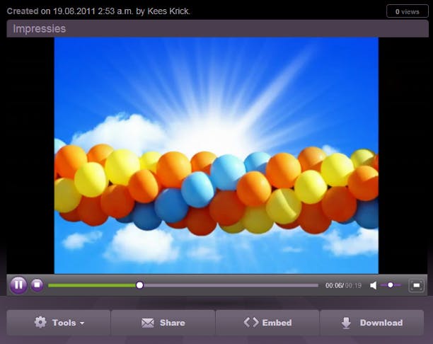 Ook wat betreft muziek hebt u de keuze om een eigen muziekbestand te uploaden, of een keuze te maken uit de Music Lounge. Vergeet niet om rechts bovenin bij Resolution het filmformaat en de resolutie in te stellen en klik daarna onder aan de pagina op Render video om uw film te genereren. Het eindresultaat kan gedeeld worden op Flickr, YouTube, Facebook en Twitter, maar ook via een eigen website (embed) en e-mail. In de gratis editie is de lengte van uw fotopresentatie beperkt tot een minuut en kunt u voor een resolutie tot maximaal 360p kiezen. Downloaden en genereren in HD (720p) en zelfs Full HD (1080p) kan helaas niet per stuk, maar pas zodra u voor een betaald abonnement kiest (vanaf vijf dollar per maand). Handig is wel dat een weekabonnement mogelijk is voor drie dollar.