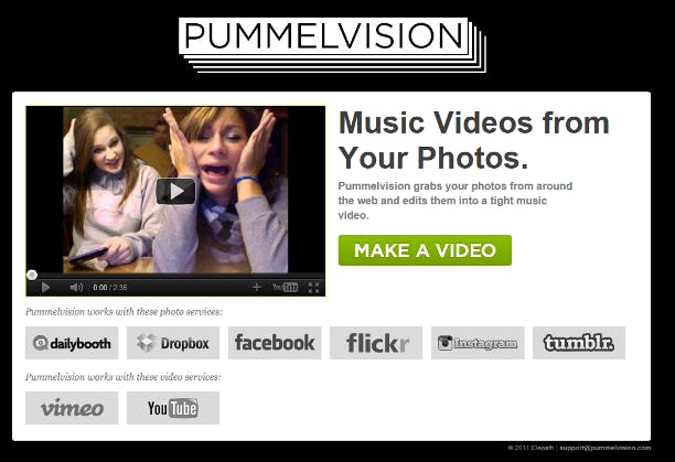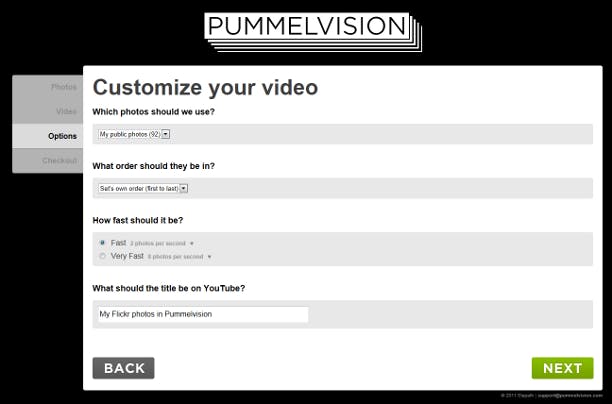 Klik op de hoofdpagina van Pummelvision op Make a video. Geef vervolgens aan waar uw foto's zich bevinden, zoals Facebook, Instagram, Flickr of Dropbox. U kunt geen foto's van uw eigen pc uploaden. Daarna geeft u aan of het eindresultaat op Vimeo of YouTube gepubliceerd moet worden. Vervolgens kunt u nog enkele instellingen veranderen, zoals de volgorde van de foto's, het tempo van de vertoning en geeft u de titel van de film op. Ook kunt u hier nog een album (Facebook) of set (Flickr) uitkiezen. Klik op Next en geef het e-mailadres waarop u gewaarschuwd wilt worden zodra uw video klaar is. Op dit moment kunt u nog wijzigingen aanbrengen door op Back te klikken of een van de tabs aan de linkerzijde te gebruiken. Weet u zeker dat u klaar bent met uw video, klik dan op Createmy video. Helaas is er maar één muziekje beschikbaar. Dat kan wat eentonig worden als u vaker dit soort films maakt.