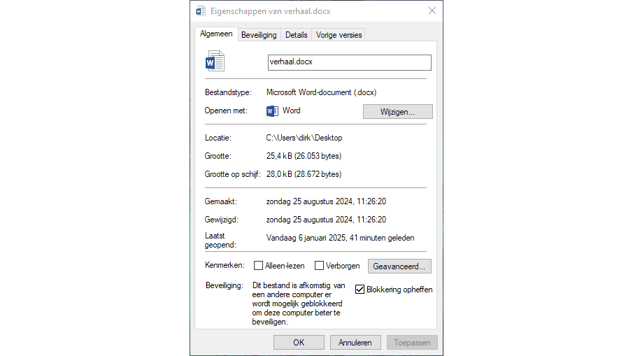 Dit probleem treedt meestal op wanneer het bestand tijdens het opslaan of verzenden gewijzigd is door software van derden, waardoor het niet meer kan worden geopend. Wat je als eerste probeert, is het bestand te deblokkeren via de eigenschappen: klik met rechts op dit bestand en kies Eigenschappen in het contextmenu. Hier selecteer je het tabblad Algemeen en daar zie je onderaan bij Beveiliging de checkbox Blokkering opheffen. Je ziet deze optie om de blokkering op te heffen uitsluitend in de eigenschappen van een document dat geblokkeerd is. In een goed werkend Word-bestand vind je deze optie niet. Zorg dat dit selectievakje is aangevinkt en klik op Toepassen. Klik op OK en probeer dan het bestand opnieuw te openen.
