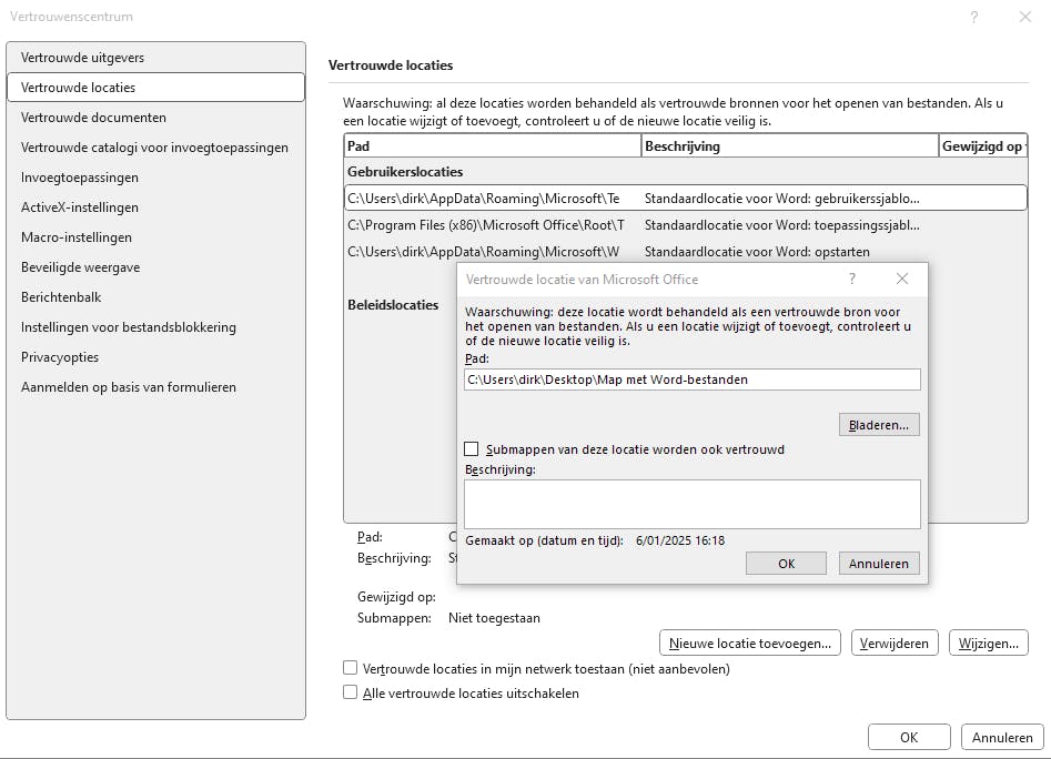 Voeg de map waar de geblokkeerde Word-bestanden staan toe aan de Vertrouwde locaties.
