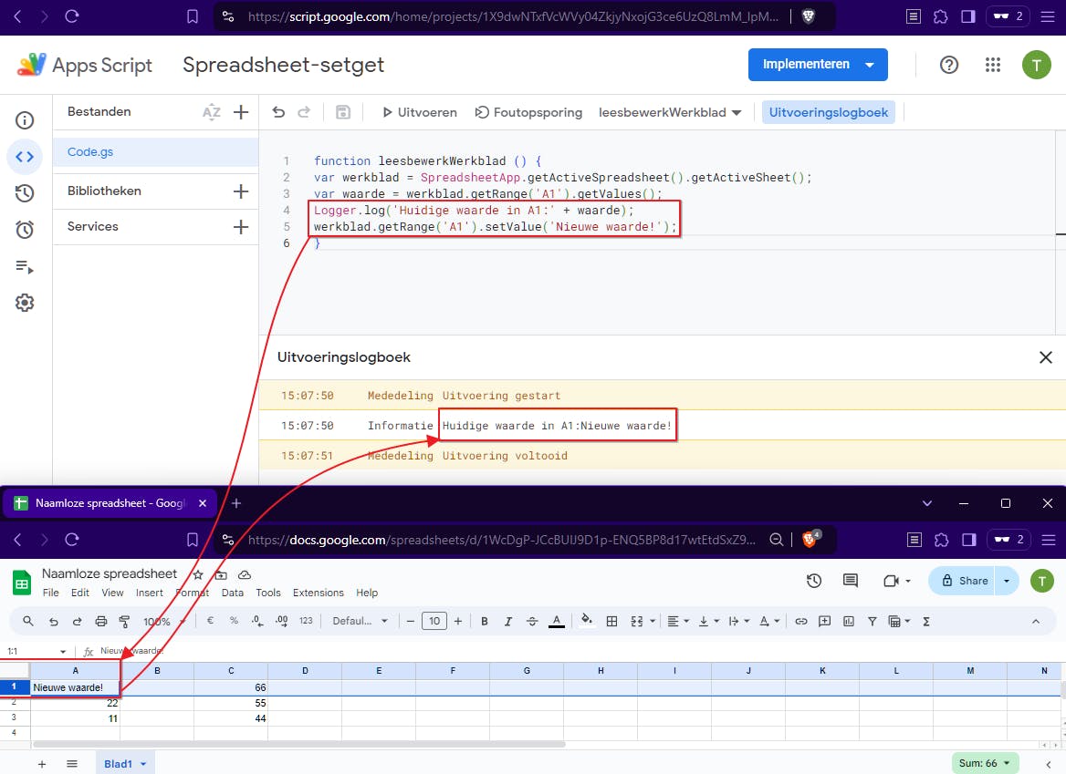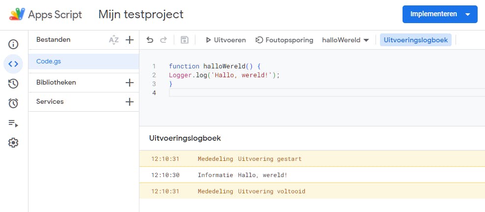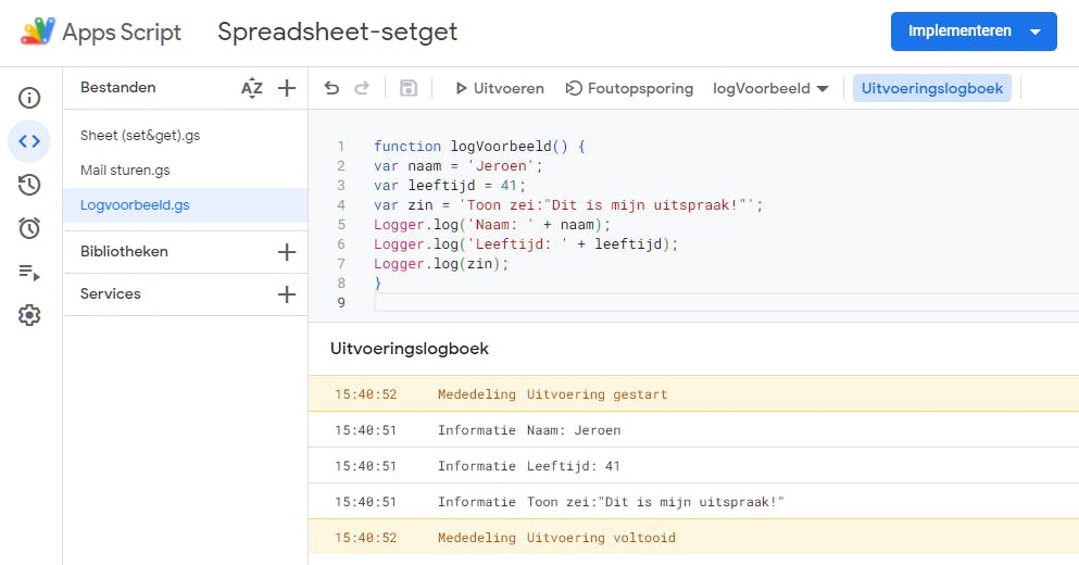 Dit eenvoudige script spreekt eigenlijk voor zich, maar let op het gebruik van de .log()-methode van het ingebouwde Logger-object. Deze methode is namelijk handig om te volgen wat er in je script gebeurt of om te debuggen. Door de aanroep bijvoorbeeld vlak voor een mogelijk probleem te plaatsen, kun je de uitvoer van variabelen of berekeningen controleren terwijl het script draait.