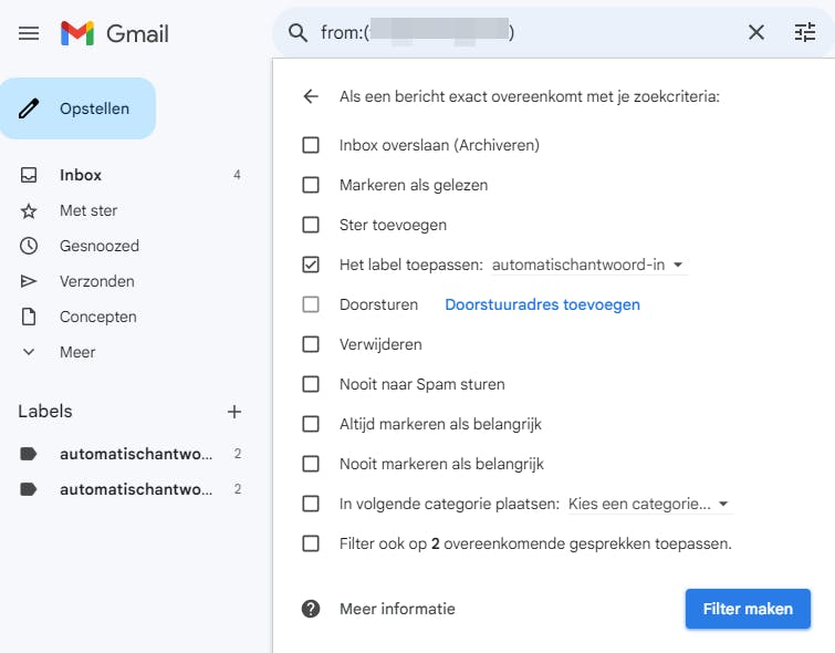 Klik in Gmail op het schuifbalk-knopje rechts van de zoekbalk, vul bij Van het e-mailadres van de gewenste afzender(s) in en laat de overige velden leeg. Klik op Filter maken, vink de optie Het label toepassen aan, kies Nieuw label en geef het label een naam, bijvoorbeeld automatischantwoord-in. Bevestig met Maken om binnenkomende e-mails van de opgegeven afzenders automatisch aan dit label (een soort mailmap) te koppelen.