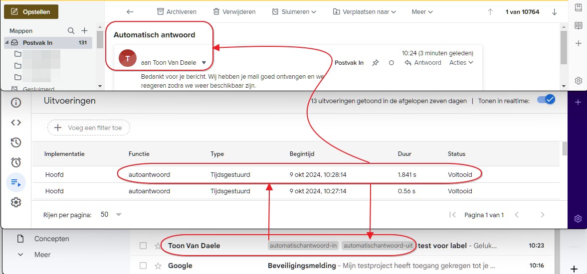 Het script in werking: label lezen en toekennen, en automatisch antwoord versturen.