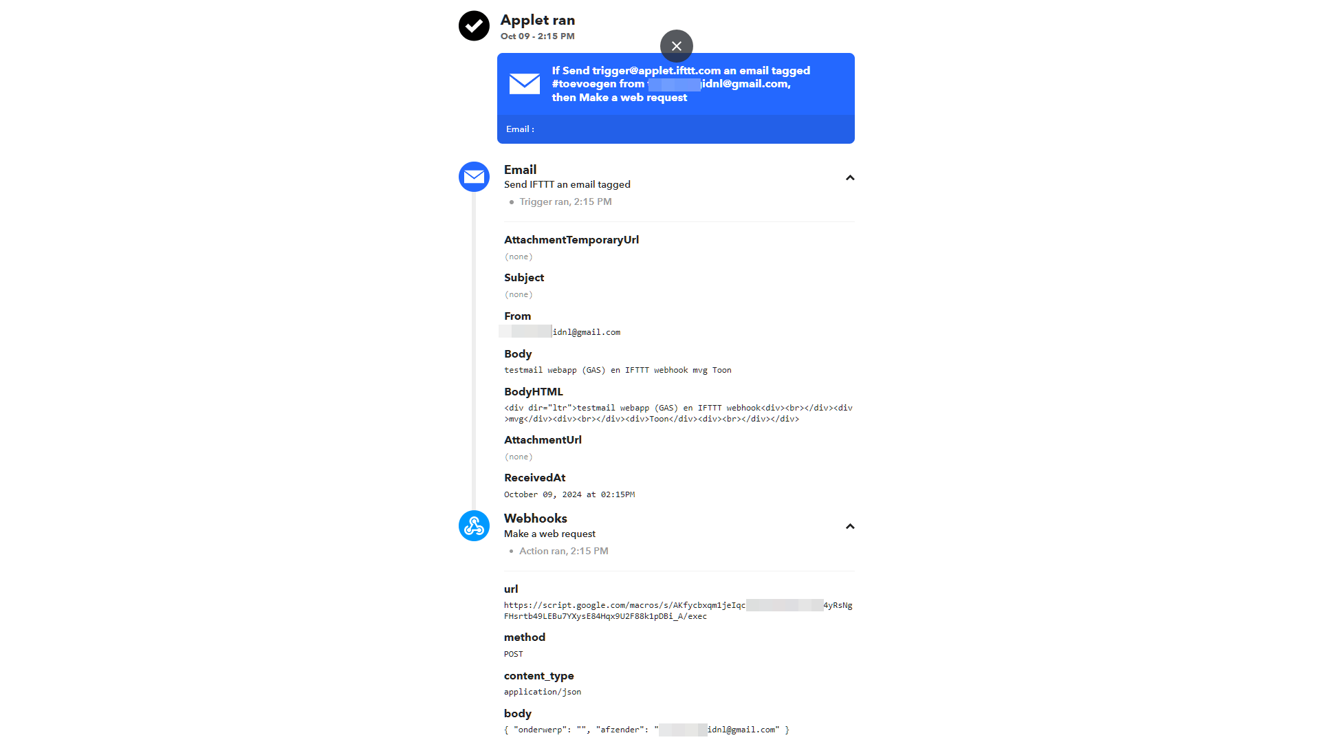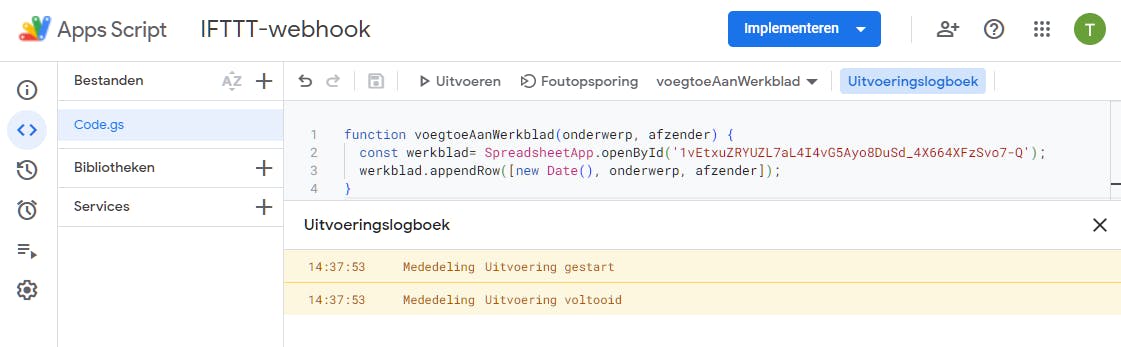 De IFTTT-applet werd getriggerd en zet via de webhook ons script in werking.