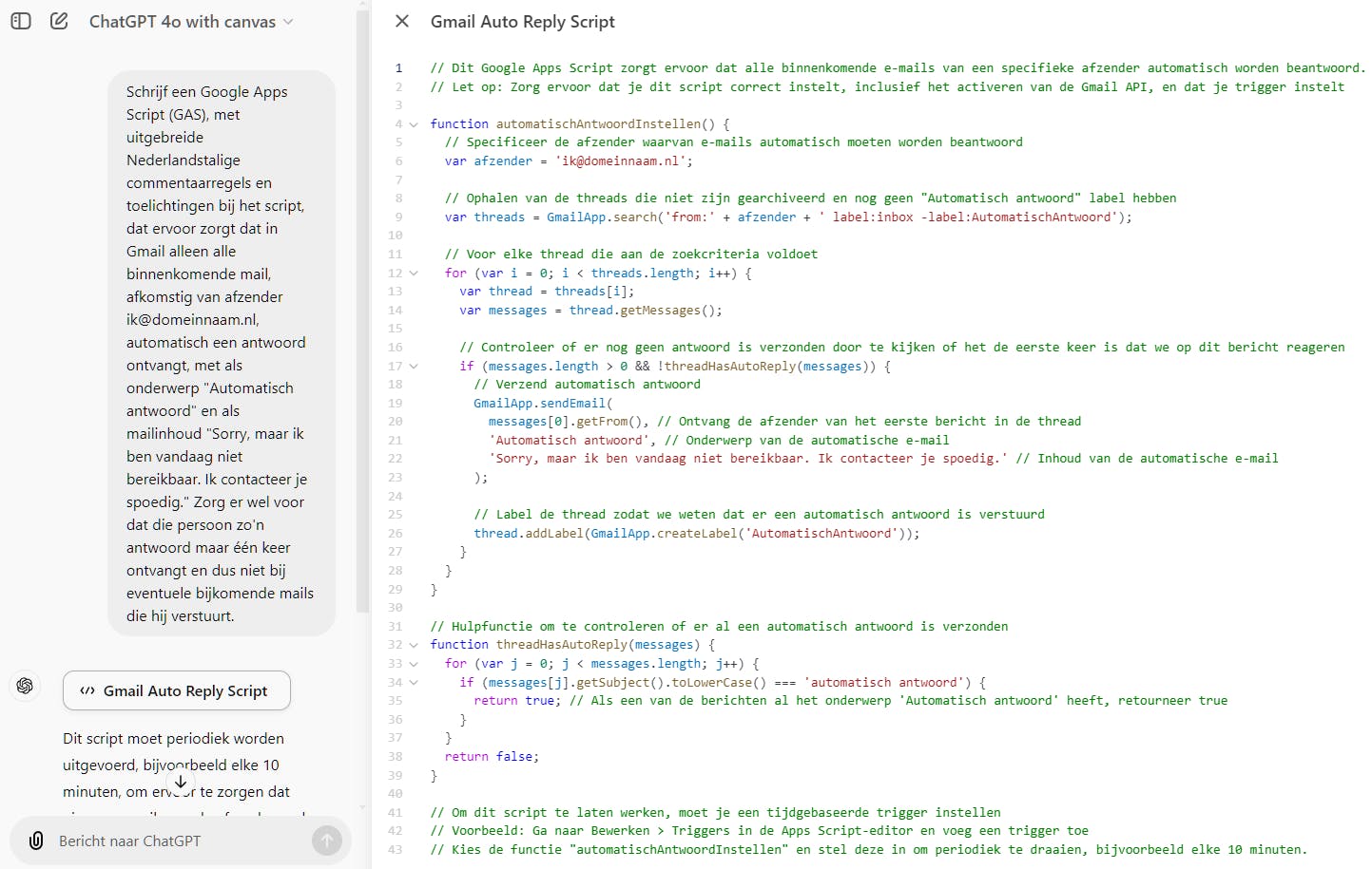 Meld je aan bij ChatGPT en kies (indien beschikbaar) ChatGPT 4o with canvas. Geef uitgebreide instructies voor het beoogde Google Apps-script en vraag om verhelderende Nederlandstalige uitleg. De kans is bestaat dat de gegenereerde code in je GAS-editor meteen werkt. Zo niet, leg uit wat er misgaat, omschrijf eventuele (fout)meldingen en stap voor stap kom je dan meestal toch een werkend eindresultaat.