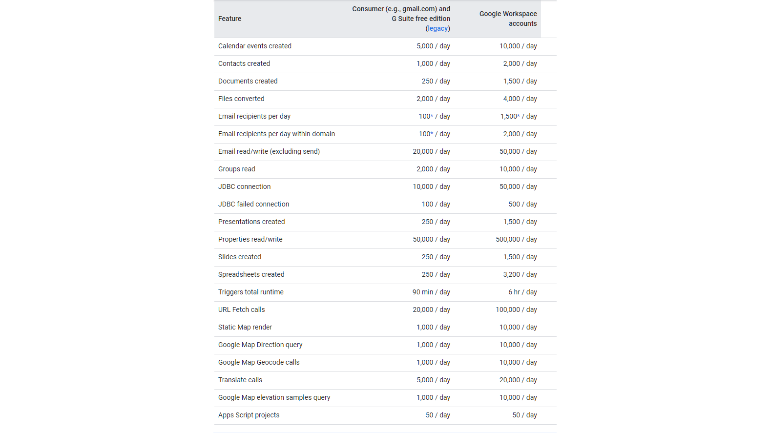 Gratis accounts hebben enkele beperkingen vergeleken met betaalde Google Workspace-accounts. Zo kun je maximaal 100 e-mails per dag versturen via MailApp, maar bijvoorbeeld wel 20.000 e-mails lezen. En je kunt tot 250 dia’s en spreadsheets maken. Voor een volledig overzicht van de quota voor zowel gratis als betaalde accounts kun je terecht op deze webpagina.