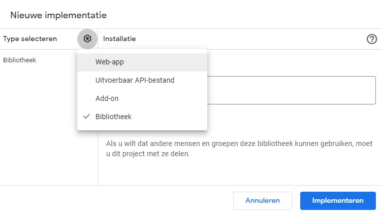 In de GAS-editor vind je rechtsboven de knop Implementeren. Deze optie bespreken we kort, omdat je deze vooral gebruikt om je script openbaar te maken of bruikbaar te maken buiten de editor. Wanneer je Nieuwe implementatie selecteert, heb je verschillende mogelijkheden.