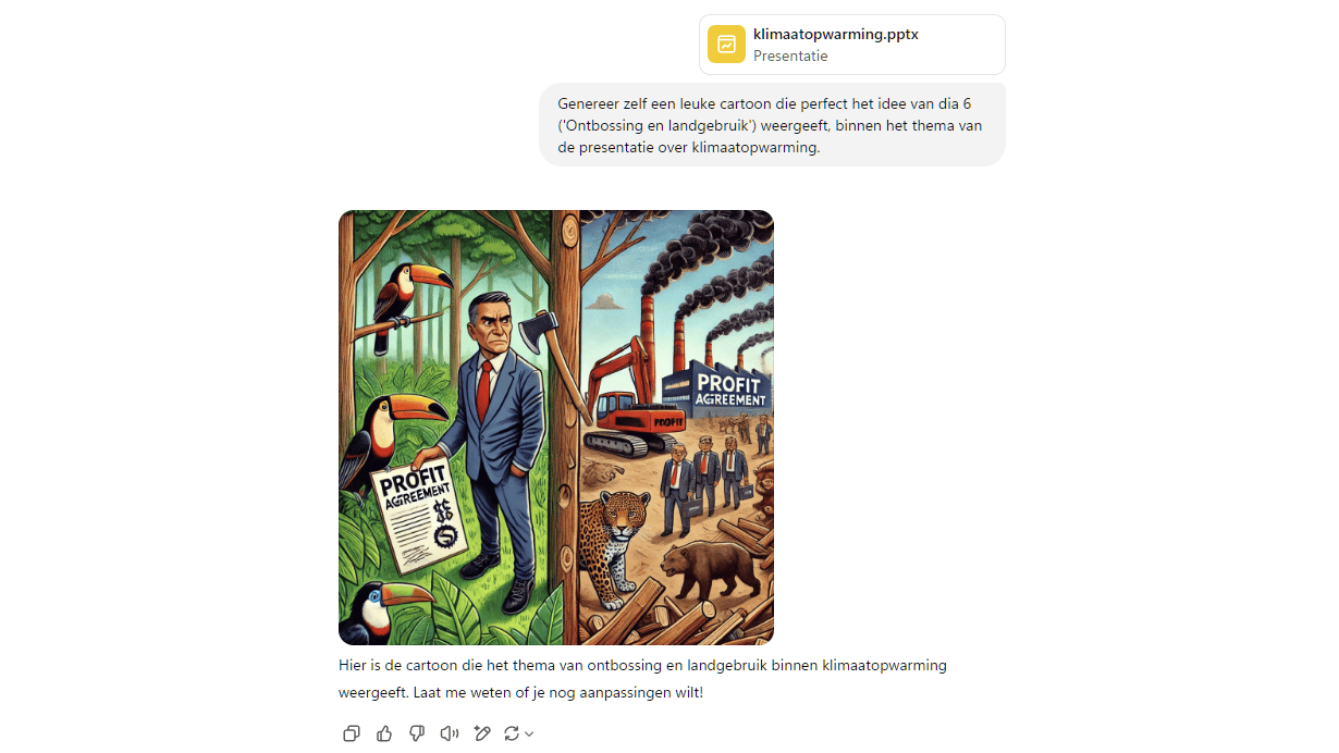 Je kunt bijvoorbeeld een schermafbeelding van een dia maken en deze uploaden naar een chatbot (bij ChatGPT via het paperclip- of plus-pictogram), met een prompt als ‘Genereer uitgebreid gesproken commentaar bij deze dia uit mijn powerpointpresentatie’. Nog handiger is het wellicht om je volledige pptx-bestand te uploaden en een gerichte prompt te gebruiken, zoals ‘Geef uitgebreid commentaar voor de spreker bij dia 6 over ontbossing en landgebruik’, ‘Vind op internet copyrightvrije afbeeldingen die goed passen bij dia 6’, of ‘Genereer een leuke cartoon die perfect aansluit bij dia 6’.